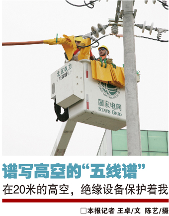 在王钊穿戴好各种绝缘设备之后,他和他的同事被电力工程车举到了将近4层楼的高度,在通着电的电线旁边进行着接引流线的工作。同行的同事一边昂着头关注着王钊,一边说道:“这种接引流线的工作较为常规,对于经常在一线工作的职工来讲,并没有很高的难度,只要穿戴好绝缘设备,正常安全操作基本没有问题。”
