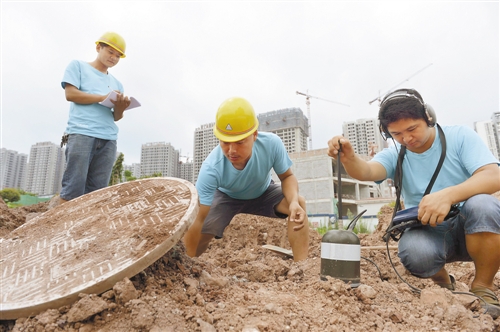 7月27日,在沙坪坝区陈家桥,巡查员正在用测漏仪等检查管网。