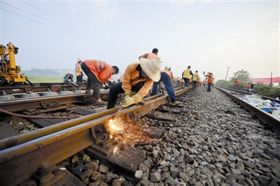 近日天气炎热,南昌铁路局鹰潭工务段的护路工人凌晨5点钟就开始了维护作业。清晨8点时,轨道附近气温已经上升到37摄氏度。