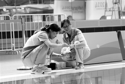 “我们好比是卫生专管员和联络员,需要联系、协作、调度卫生监督所、疾控中心、爱卫办、消杀中心等多个部门,一旦发现问题及时督促整改。”戴心声说:“举例来说,参加游泳和跳水项目的运动员来自不同国家,携带的不同细菌会在游泳池里汇集,如果水质不达标,运动员有可能染上红眼病、皮肤病等疾病,因此我们每场比赛前后都必须用快检设备进行检测。”另外,赛事期间天气热、观众人数多,为了防止有人晕倒,戴心声和赵敏将时刻注意场馆内一氧化碳、二氧化碳和气温的监测数据,适时提醒工作人员增加新风量。如果有运动员发生意外需要就医,她们也必须及时了解情况,并反馈到医疗指挥中心,防止传染病的发生。“这些事听着简单,做起来却不可马虎,包括面对供水污染导致运动员腹泻,采访时记者中暑等突发情况该如何处置,我们都演练过好多次。”
