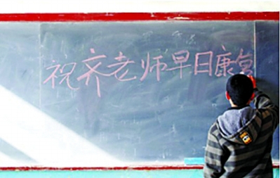学生们在教室的黑板上写下了心里话:齐老师,祝您早日康复!齐老师,您什么时候回来给我们上课?齐老师,我们十分想念您,我们等您回来。