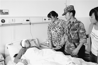 图为余才皓(右二)在鲁甸县人民医院看望在地震中受伤的母亲。李发兴摄(人民视觉)