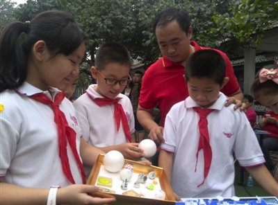 他挨个讲解:原来直径7厘米的小球,下潜回来被压缩到4厘米;网球大小的球挤压变成乒乓球,学生事先写的祝福语难以看清;圆锥体缩小了若干倍,摸上去已没有原来的柔软,硬得跟石头一样。他给每个班主任发了实验前的泡沫模型,鼓励学生用最大的力气挤压,看看模型变小多少。随后,他拿着实验模型在学生中走了一圈,每一处都引得学生争相触摸,相互窃窃私语:“我们使劲也压不出多小,深海的压力太厉害了。”