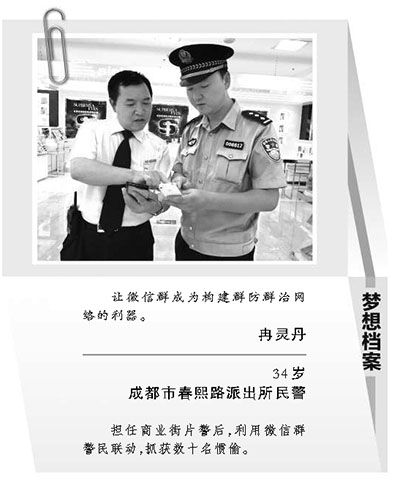今年初,冉灵丹为方便工作信息交流,开设了“小冉警官微信群”,力邀各商家的治安负责人加入。很快,微信群里“入驻”了几十名成员,他们都是各家商场、百货公司的保安负责人。刚开始,互不相识的成员们很少发言,群里冷冷清清。“群主”冉灵丹便经常分享一些防火防盗的小常识、小故事,慢慢地,群里发言的人多了起来,大家也纷纷将自己的治安工作经历拿到群里来“吐槽”,微信群不仅变成了冉灵丹联络治安工作的工具,也成了各单位保安负责人交流业务的平台。