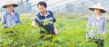 徐志坚(中)在苗木基地查看木槿花的生长情况。 汪舒宁 摄