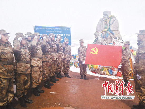 9月27日,在海拔5231米的唐古拉山口,总后青藏兵站部某汽车团三营教导员闫红磊带领战士重温入党誓词。本报记者 王达摄