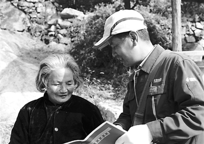 10月18日,投递员徐西国(右)在木营村和一位村民交谈。新华社记者 王建华 摄