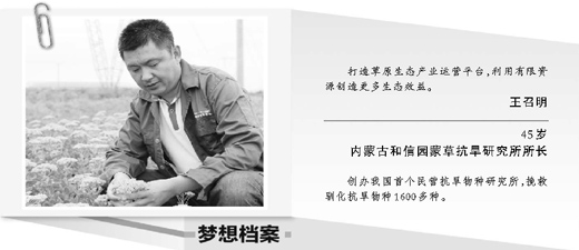 王召明出生在内蒙古乌拉特中旗的草原上,从小与羊为伴。他创办起我国第一个民营抗旱物种研究所,挽救和驯化抗旱物种1600多种,建起了可为改善我国北方生态恢复提供有力保障的种源库。为此,他获得了全国抗旱植物应用贡献奖。如今,他又组建起生态产业联盟。