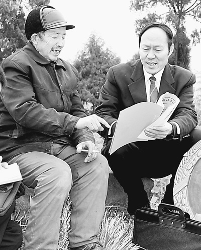 郭兴利(右)在田间地头为群众调解、办案。记者 郭 勇摄
