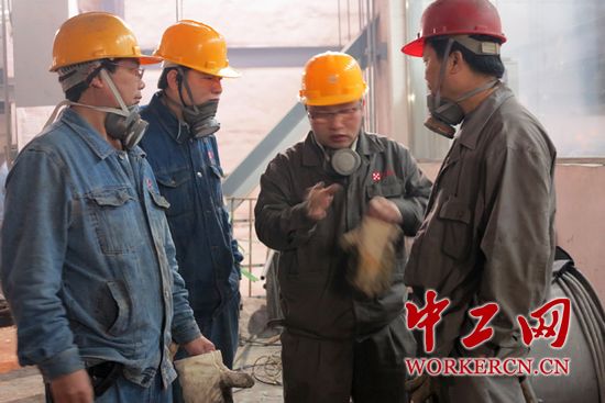 图为廖柏俊(右二)在奥炉大修现场指挥