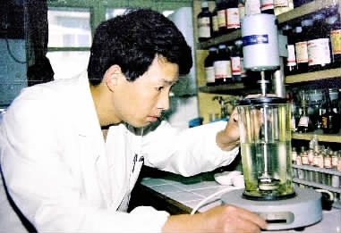 1990年,褚建新在实验室里做样品处理