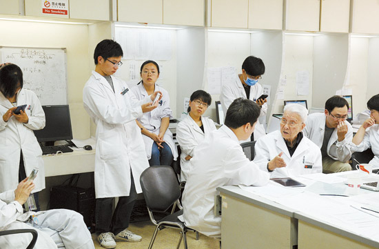 10月29日,北京又是一个雾霾天。一大早儿,北京儿童医院就诊楼里挤满了带着口罩的患儿和家长。张金哲院士换好白大褂,在同事的搀扶下来到肿瘤病房查房。病床前,他前倾着身体,以便助听器更清晰地接收到科室主任介绍病情的声音。几位观摩学习的年轻医生,悄悄地掏出了手机,给张老拍照。