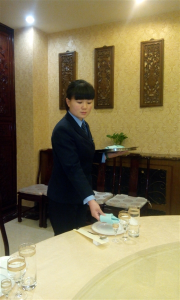 刚来到服务员岗位时,何维维要完成的工作内容看似简单,其实很考验一个新人的能力。“每天要穿着旗袍和高跟鞋,一站就是8个小时。”虽然在学校也穿过这样的工作服,但这样长时间的站立经历对于何维维来说的确是个考验。