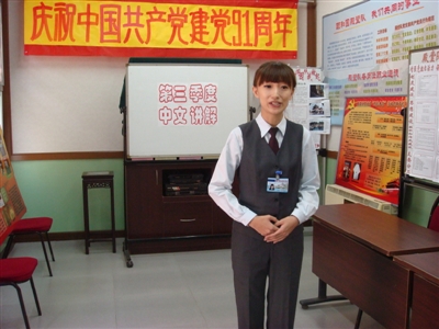 王天笑1988年出生,曾在北京市第二届职工职业技能大赛讲解员比赛中获得英文组第一名。“这是我第一次接触手语,虽然学起来有点困难,但工作之余我都在钻研,慢慢地就学进去了。让我兴奋的是,除了中文、英文,以后我又掌握了一种交流语言——手语,可以为外国聋哑人做讲解了!”