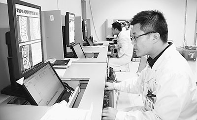 影像医师不但工作单调,而且工作量很大。每天拍X光片的患者300—500人,拍CT的150—200人,拍核磁共振的40—60人。负责看X光片的医师只有两三位,负责看CT片的只有三四人,核磁共振的只有3人。审签医师一般是2人。