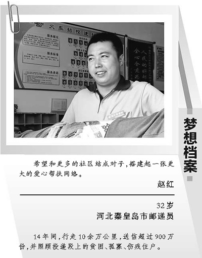 河北秦皇岛市邮递员赵红,在长达14年的投递路上,风雨无阻,行走10余万公里,送信超过900万份,其间从未出现过一次错投或漏投。老人下楼不方便,他就把邮件送上楼;用户不在家,他就贴心地留条或告知左邻右舍;收信人是行动不便的孤寡老人,他干脆当起了“保姆”。
