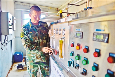 民警乌其尔正调试净水设备。