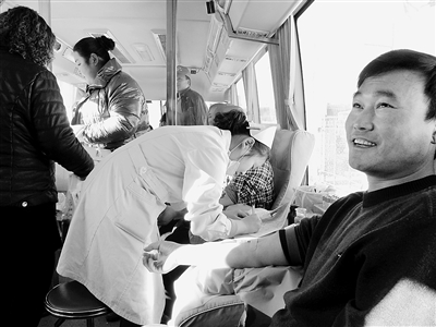 林玉才(右一)在流动献血车上献血。 李海艳摄