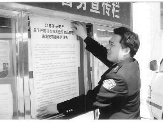 图③ 张作田在社区张贴法律通告。他的警务室是连云港市第一个以其名字命名的警务室。
