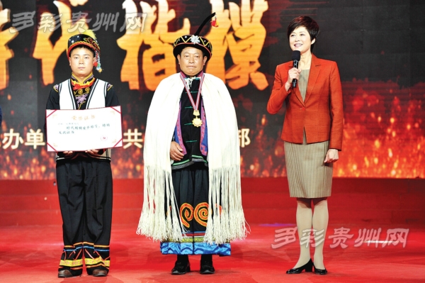 文正全、文军义叔侄俩替长辈文朝荣接过“时代楷模”纪念章和荣誉证书。