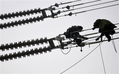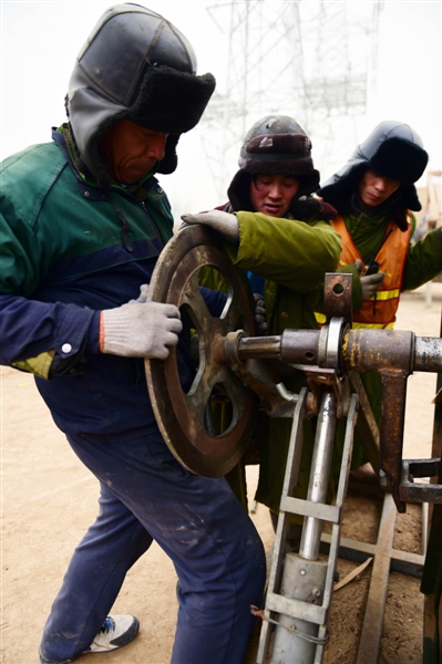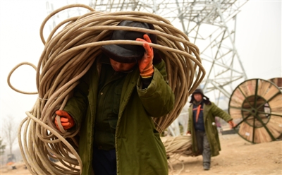 1月15日一大早,在朝阳区金盏乡的一个电力工程工地上,25岁的李海波穿上了最御寒的绿色军大衣,开始做上线前的准备工作。系好一长一短两条安全带,戴好安全帽,李海波麻利地爬上了耐张塔,今天的塔不是很高,大概60米左右,这对李海波来说没有什么挑战。