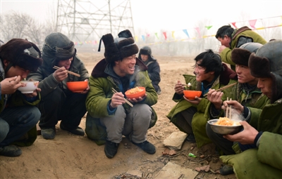 中午11点半,工地送来了盒饭。工友们凑在一起,就坐在工地一旁吃起来。尽管饭菜很热,因为天气冷又有风,还没吃完饭菜就凉了。所以,工人们都养成了吃饭快的习惯,一是想多吃几口热乎的,再是他们惦记着还有活儿在等着……(记者 张江艳/文 陈艺/摄)