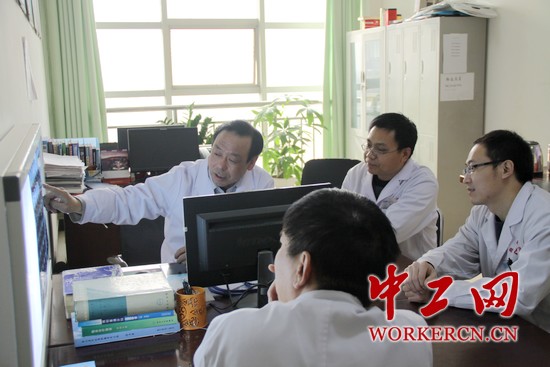 赵运成(左一)与科室同事正在集体会诊病人手术治疗方案_。郭海民摄影