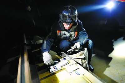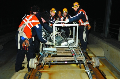 尽管立春已过,天气逐渐转暖,但深夜两点钟左右的高架桥上气温仍然在零下10℃左右,几分钟内寒气就透过外衣、帽子和鞋袜钻进来,全身冰凉。但他们顾不上严寒,迅速分工。巡视组开始组装梯车,登梯巡查。高铁接触网距铁轨5.3米,队员熟练地爬上近5米高的梯车,仔细检查每一个线路节点。梯车是用钢管螺丝临时组装的,站在上面摇摇晃晃,但每个队员都如履平地。远远看上去,真有点像是挂在输电线上的大蜘蛛。