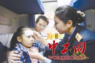 K571次列车长卢荣正给小乘客贴退热贴。