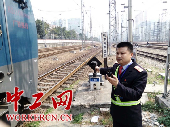 这名“交警”叫黄涛,他是广铁集团株洲机务段郴州运用车间的一名党员指导司机。春运期间,这个车间承担了京广线郴州至广州、广州东站、江村站共计142趟临客列车往返的牵引任务。黄涛的工作就是负责临客列车在广州东站对标停车、指挥机车进库、转线和始发临客正点开车。