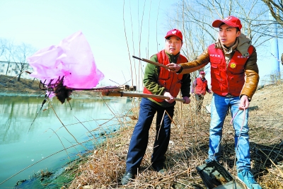 3月1日上午,初春的阳光普照大地,通州区萧太后河的河面上寒冰早已融化。一队穿着红色马甲、戴着红色檐帽的人,手拿耙子、叉子、铁锹等工具,在河岸边忙碌,将水中和岸边的垃圾捡拾干净。三个小时里,他们清出各种颜色的塑料袋、漂浮的碎木板、沾满黑色污泥的废弃日用品……垃圾发出难闻的臭味,泥土很快弄脏了他们的鞋和衣服,还有队员一不小心滑进河水里,但他们都没有停止工作。