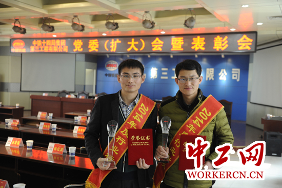 春节前夕,在中铁十四局集团三公司2014年度表彰大会上,15位手捧奖杯、身披绶带的领奖者成为全场耀眼的明星。他们是从全公司两千多名职工中评选出来的行业标兵,是各自行业中的领头人、佼佼者。而其中有两位身材相近、长相酷似的年轻人,更是成为众人瞩目的焦点。他们就是三公司2014年度试验室主任标兵靳长辉和安全部长标兵靳长峰,两个“铁二代”,一对亲兄弟。
