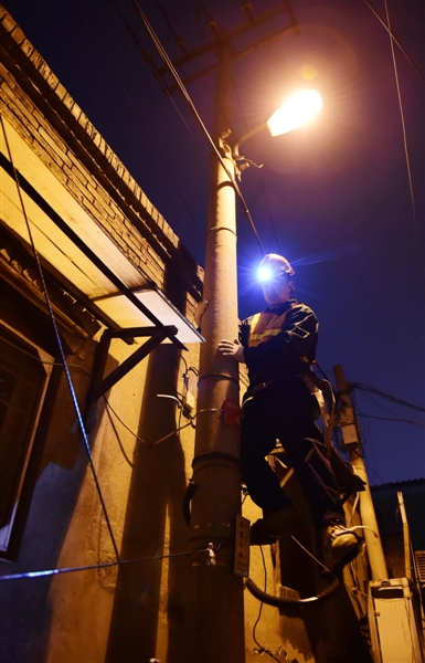 爬杆、修灯……很快,胡同里另外一盏坏了的路灯也在张福明的努力下绽放了明亮。他们马不停蹄地奔赴下一个胡同,开始巡修工作。
