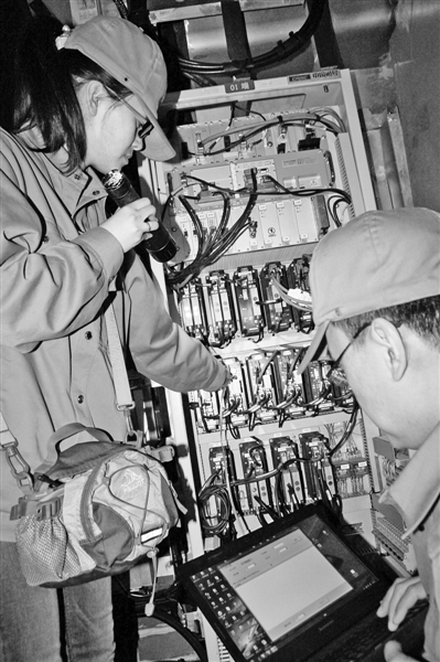 午夜时分,得知京石高铁动车组驶入检修车间后,作业组长吕斯带着同事,带上手电和录像设备,开始忙碌起来。记者看到,她首先带领检修人员进入高铁动车内对行车大脑实施检查,查看列车首尾主控机箱和线路指示灯状态以及驾驶室内的显示屏数据是否准确无误。对提示存在问题的列车,要进一步排查故障原因。