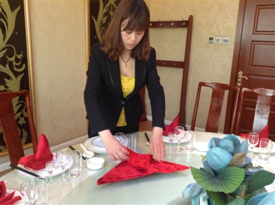 只见她手一抖,桌布立即像渔网一样撒开,在空中划出完美的抛物线,准确地落在桌子上,桌布的中轴线,正好与餐桌的中轴线重合,桌布自然下垂形成的4个角,正好均等。这个抖桌布的人就是第五届北京地区烹饪服务技能竞赛餐厅比赛金奖获得者、北京凯思大酒店领班王盈盈。