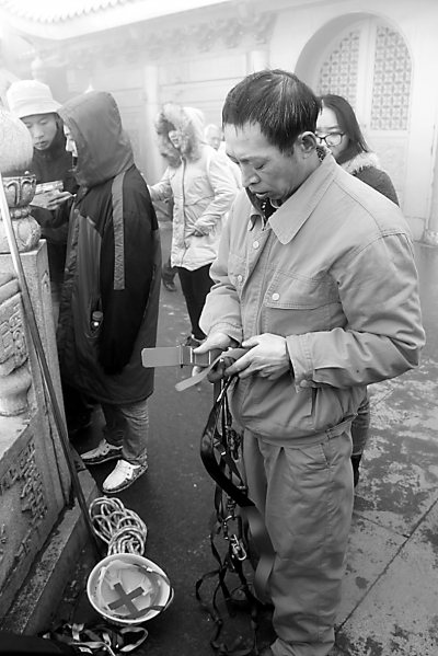 “这些专业吊索还是有使用寿命的,3年换一次。虽然有时候看起来绳子还是很结实的,但到期必须更换。自己的命都在这根吊索上,马虎不得。”彭文才说,“之前,用钢绳和麻绳配合下崖时,需要好几个人在上面拉住绳索加强保护。现在有专业装备了,我就试着不要别人帮忙自己干,已经干了六七年,熟练了就没啥子问题。当然,有人在上面守一下最好,以免有游客好奇或者小娃娃恶作剧,把我的绳索解开了,那我根本没法爬回金顶,危险还是有的。”