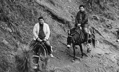 王偏初(左)骑马行进在去学校的山路上。记者 张 文摄