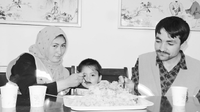 坐在社区饭桌前,阿依努尔不时地给四岁的女儿喂几口抓饭,肉孜·买海提津津有味地吃着午餐,夫妻俩不时相视而笑。梦想虽有距离,但幸福在他们眼中并不遥远。(图本报记者李琳)