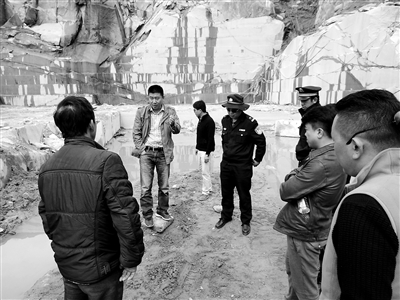 图为刘强(左二)在查处非法矿山企业现场。 本报记者 王晓莉 摄