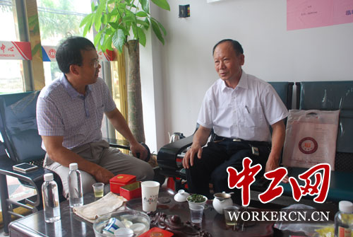林秀川在接受《泉州工人》总编张晞采访时,回顾23年来义务招工历程。李亮 摄