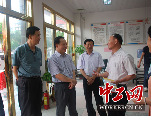 泉州市总工会党组书记、常务副主席赖畅水(左二),与马甲镇林秀川劳务职业介绍所负责人林秀川(右一)交流。李亮 摄