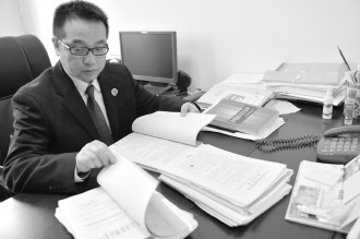 图为董文欣正在翻看厚厚的案件材料,为讯问工作做好充足准备。
