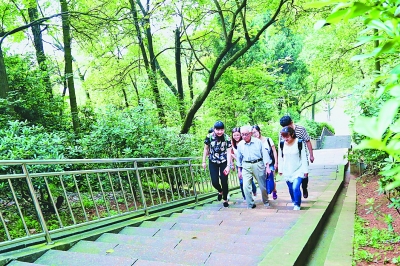 曾子其(中)与学生走在勤人坡139级台阶上。张灿强摄