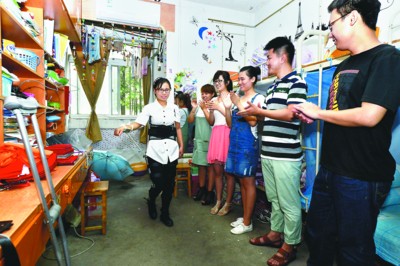 朱金凤和同学在寝室里展示多功能新拐杖。