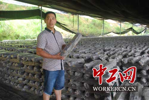 农民工创业者赖有火向记者介绍食用菌生长情况。