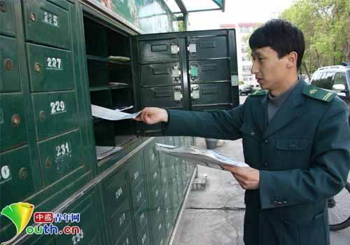 马建新将邮件投递到住户的邮箱中。这样的工作,他一做就是十八年。资料图