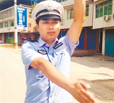 记者远远地观望着正在指挥交通的民警,旁边负责查究低速载货汽车违法行为的民警朱柯告诉记者,正在指挥交通的是金碑派出所所长杜虹霖。“今天是赶场日,人流、车流特别多,街道十字路口没有设红绿灯,只要行人、车辆一聚集就容易引发交通拥堵,为了防止拥堵的现象,我们必须提前采取措施。”他说,“一般情况下,我们一天至少需要站岗指挥4个小时。”他告诉记者,炎热的天气和超负荷的工作,加上汗水的浸泡和衣服的摩擦,他们背部都开始长痱子。腿站麻了,腰站木了,很多人因疲劳过度而病倒。可是为了确保街道交通的正常运行,没有一个人在困难和疾病面前退缩。