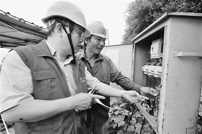 钱海军(左)到地头检查农村电网表箱。 姚科斌摄