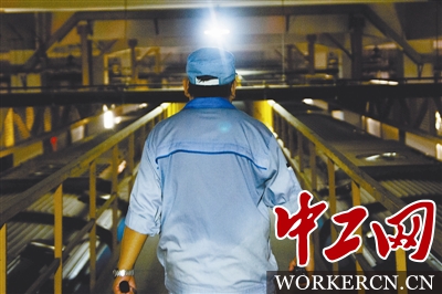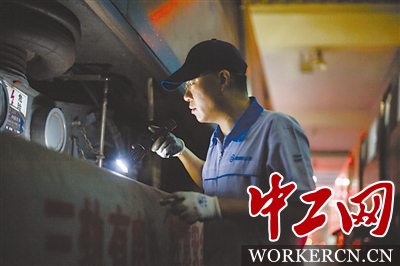 ←8月6日22:09,列检员刘江师傅为回库列车做维护检查。2014年6月27日,正是他的认真检查,才避免了一次列车重大事故的发生。