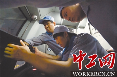 →李健民班长(图左)带领两位“90后”列检员一起调试列车操控台。